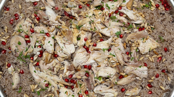 نضيف الصنوبر المحمّص ونقلب قليلًا لمدة دقيقتين حتى نتأكد من استواء اللحم، ثم نضعه جانبًا.