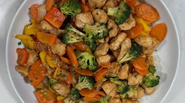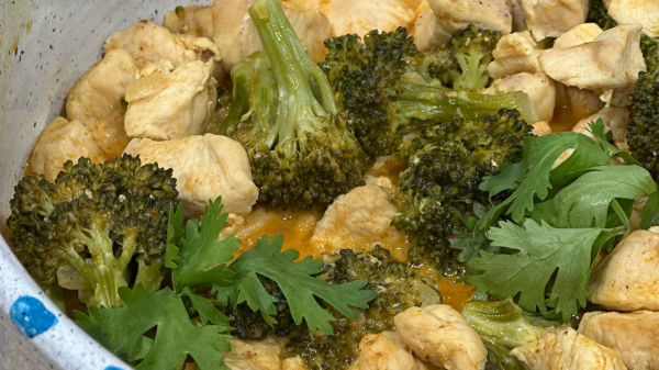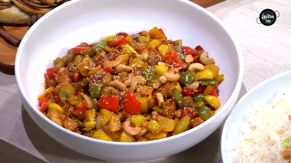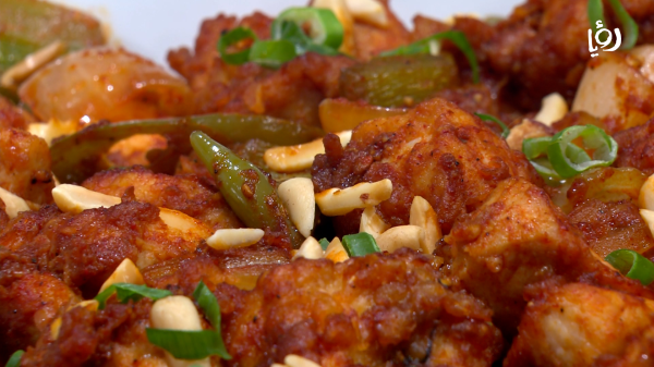 في مقلاة على النار، نسخّن الزيت النباتي ثم نضيف الدجاج ونقلّبه حتى ينضج تماماً من الوجهين، ثم نضعه جانباً.