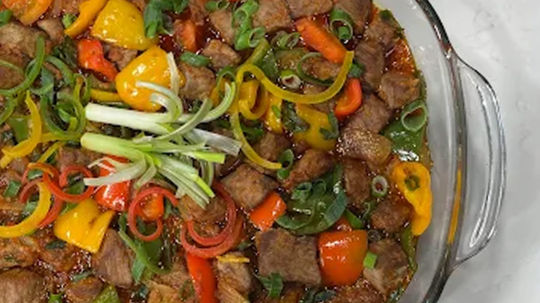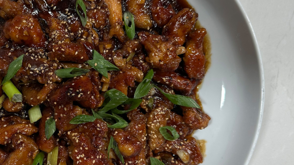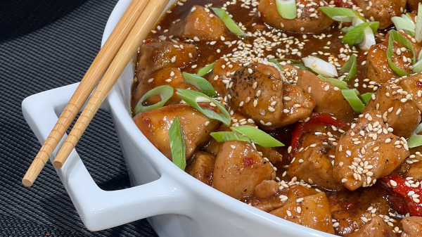 نضيف خليط التتبيلة مع السكر البني ونتركه يغلي دقيقة واحدة، ثم نعيد الدجاج إلى المقلاة ونقلّبه مع الصوص.