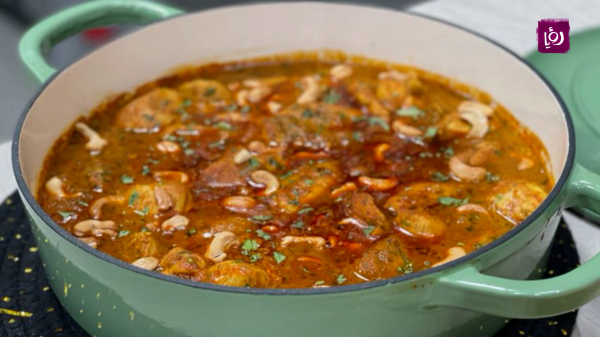 نضيف ملعقة من معجون مصنوع من الفلفل الأخضر الحار، الزنجبيل، والثوم. نخلط جميع المكونات جيداً باليد حتى تتجانس.