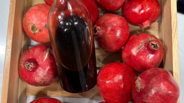 نضيف منقوع التمر الهندي ودبس الرمان ونحرك المزيج جيداً.
