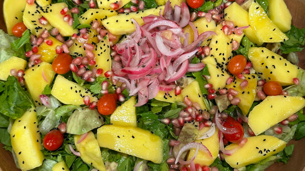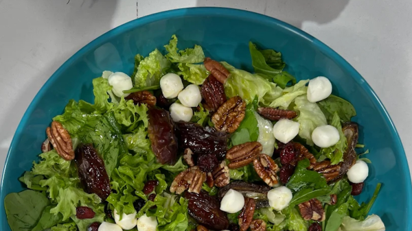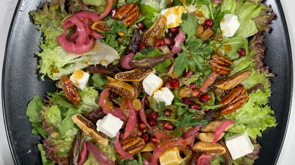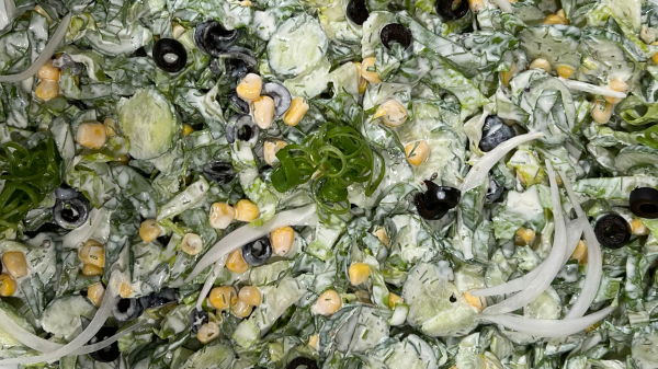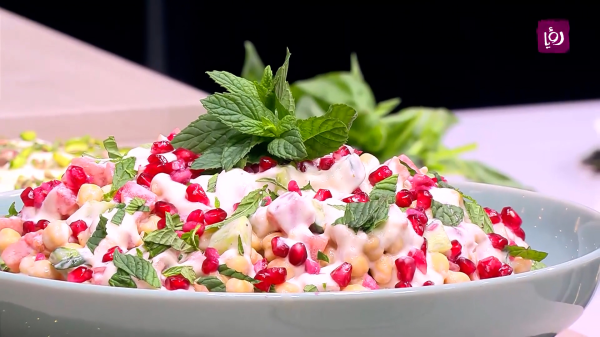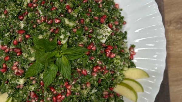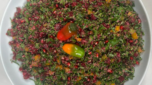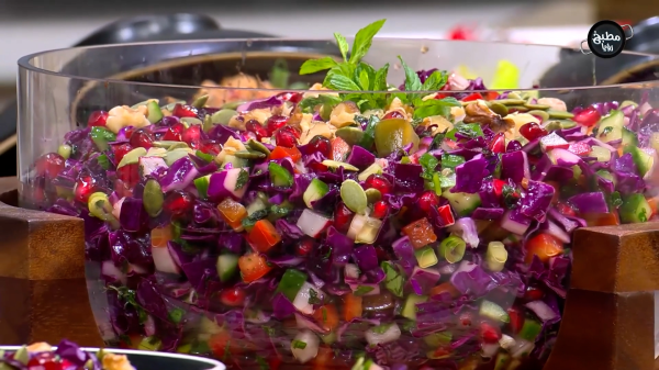 نضيف أوراق النعناع، الزعتر، البقدونس، الجرجير، البصل الأخضر، والفجل المقطع.