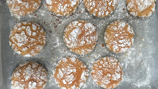 نفرد عجينة البسكويت ونرصها بشكل متساوٍ في قاع صينية مربعة مبطنة بورق الزبدة.