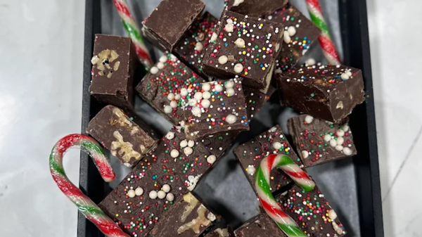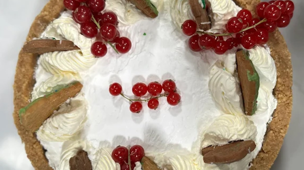 نرش كمية وفيرة من الشوكولاتة والحلوى المقطعة (مثل الويفر، المالتيزرز، وM&Ms) على الوجه، ونضغط عليها برفق لتلتصق بطبقة الشوكولاتة.