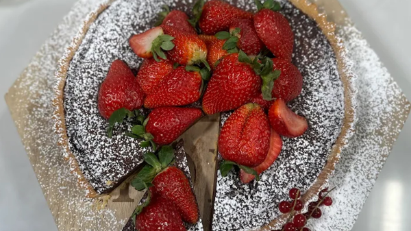 نسخّن الكريمة في قدر على النار حتى تصل إلى مرحلة ما قبل الغليان. نسكب الكريمة الساخنة فوق الشوكولاتة المقطعة في وعاء، ونتركها قليلاً ثم نحرك جيداً حتى تذوب الشوكولاتة تماماً ويصبح المزيج ناعماً.