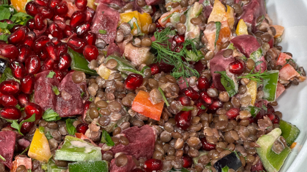 نضيف الشمندر المسلوق والمقطع، ثم البطاطا والجزر المسلوقين والمقطعين إلى مكعبات.