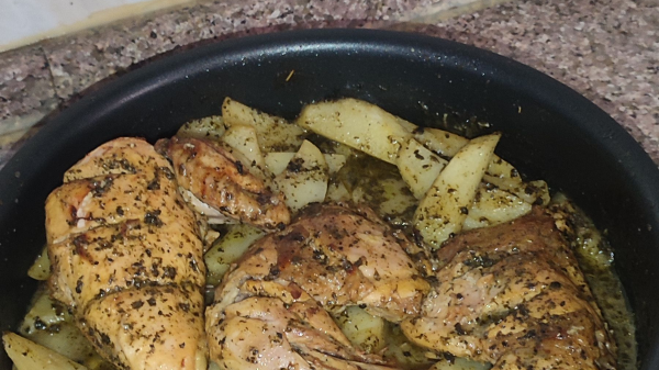 في مقلاة على نار مرتفعه نضع زيت نباتي وشرحات دجاج رفيعه نقلبها حتى تجف السوائل ويتغير لون الدجاج.ثم نضيف بصلة متوسطة مقطعه شرحات رفيعه وفلفل حلو شرحات وملعقة صغيرة ثوم مهروس. نقلبه ثم نضيف البهارات ( ملح ،فلفل اسود، بابريكا، بهار مشكل، ملعقة صغيرة زعتر مجفف.ثم نرفعها عن النار وتترك حتى تبرد.