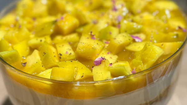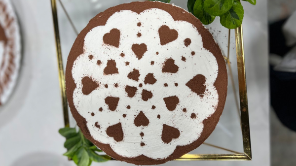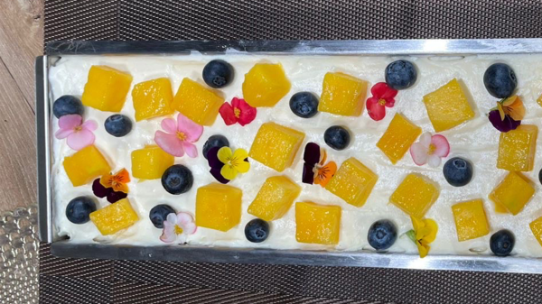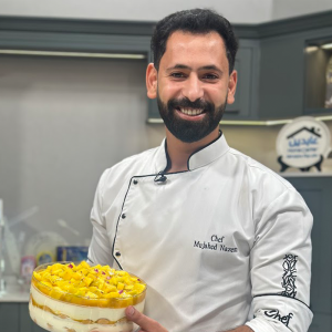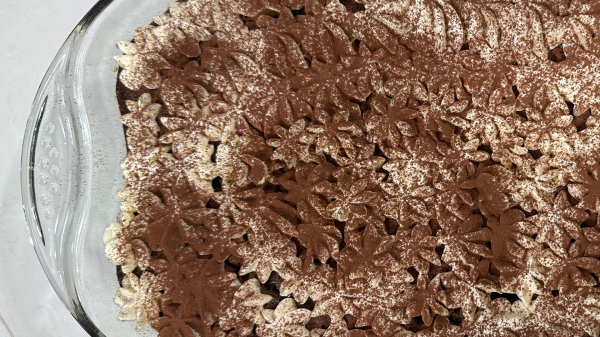 تُضاف الكريمة المخفوقة تدريجيًا وتُقلب برفق باستخدام سباتولا بحركة طي من الأسفل للأعلى حتى تتجانس. تجنّب الخلط المفرط للحفاظ على قوام كريمي هش وخفيف.