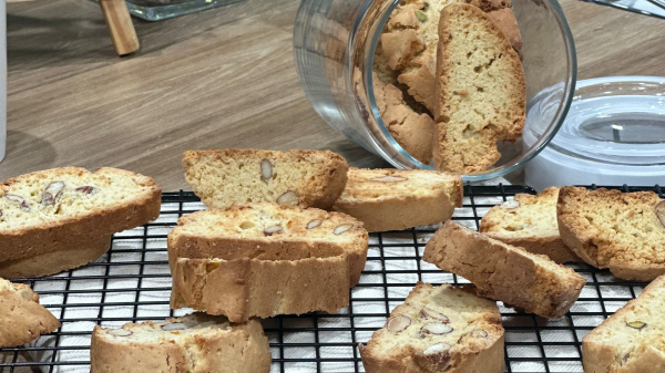 تُغمس كل قطعة بسكويت ليدي فنجرز بسرعة في الإسبريسو (غمسة سريعة لكل جانب). لا تُترك لتنقع كي لا تصبح طرية أكثر من اللازم.