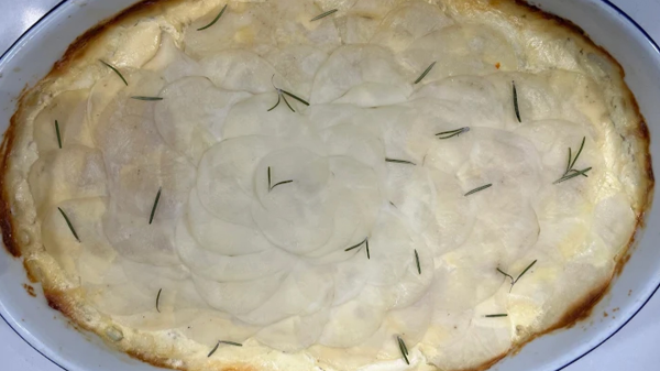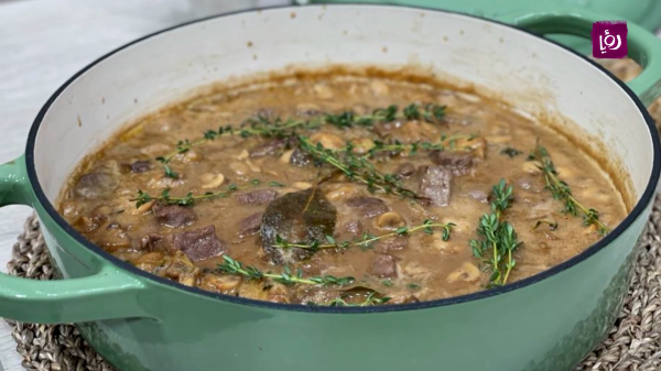 نضيف الكراث والجزر المقطعين إلى شرائح رفيعة (جوليان) إلى القدر. نقلب المكونات معاً ونضيف أغصان إكليل الجبل (الروزماري) والزعتر الطازج لإضافة النكهة.